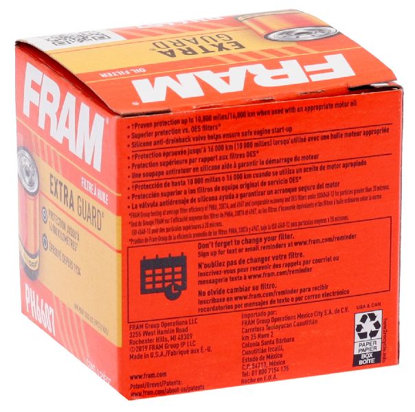 • FRAM Extra Guard® oil filters deliver advanced engine protection for everyday drivers who perform routine oil changes at OE (original equipment) recommended intervals. Equipped with SureGrip® technology, FRAM Extra Guard® oil filters provide a non-slip surface allowing for easy install and removal. The silicone anti-drain back valve ensures safe engine startups, extending the life of the oil filter for up to 10,000 miles (16,000 kilometers).